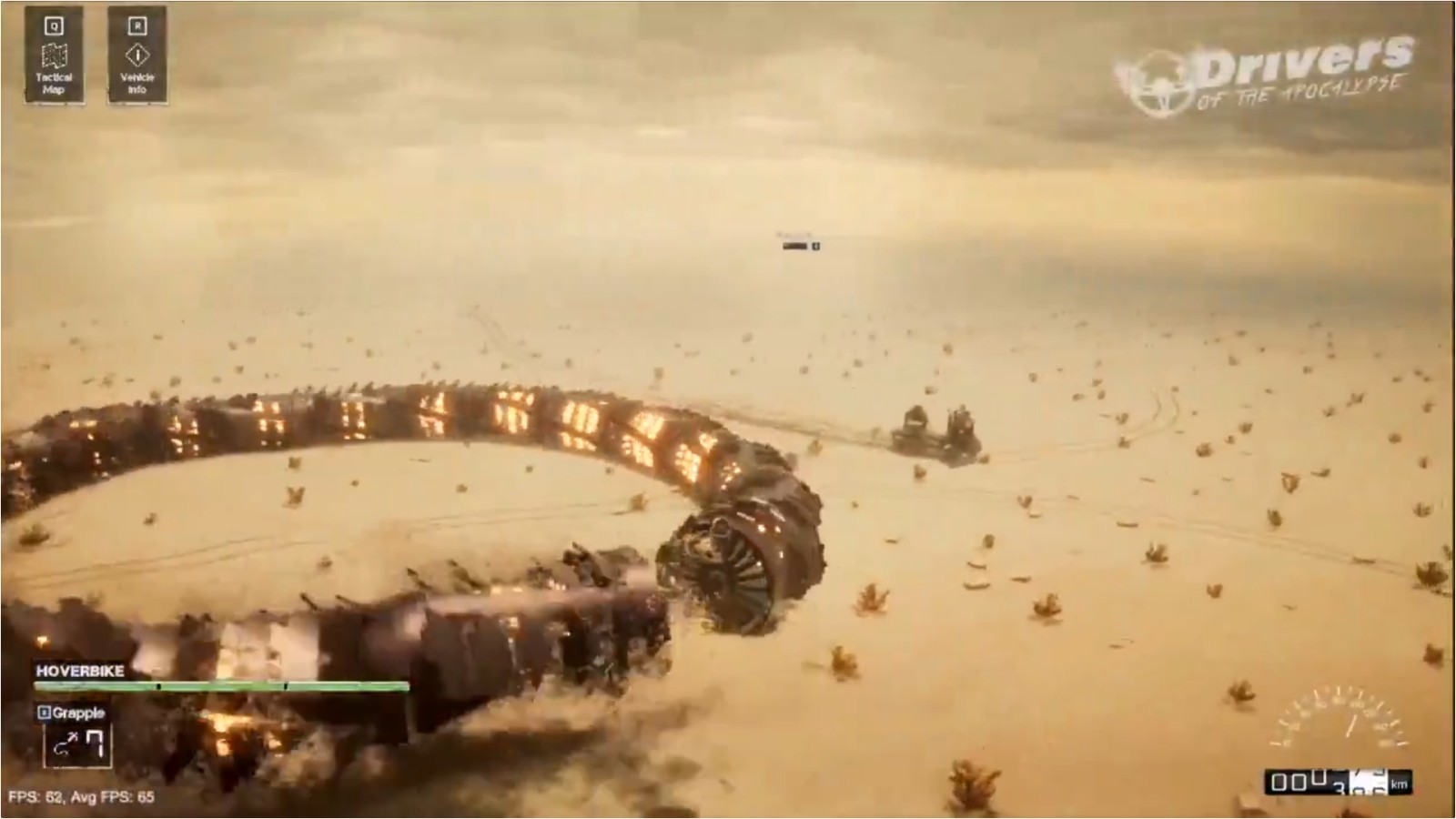10 月 5 日釋出的開發影像,最吸睛的莫過形似巨型管狀生物的特殊車輛,它在槍林彈雨中如沙蟲般穿梭荒野、追擊敵車、將敵人吞噬般地擊潰,氣勢十足。