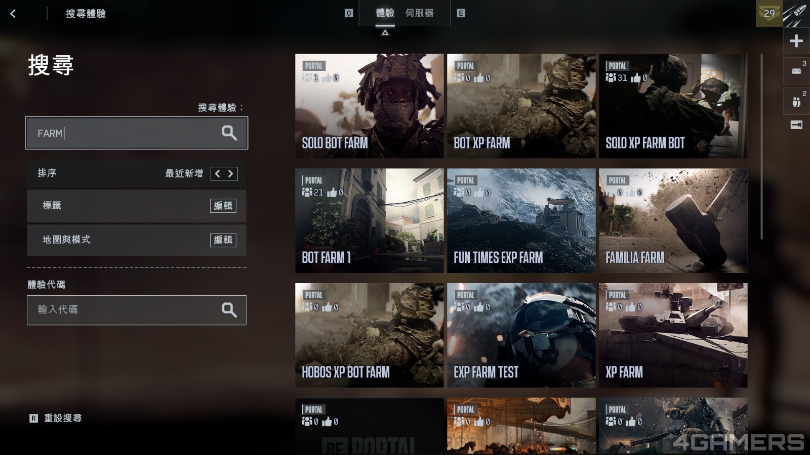 玩家可以進入遊戲主畫面的「社群」頁籤,往下滾動到「體驗搜尋」,在搜尋欄中輸入「XP Farm」,找到各種由玩家製作的地圖,裡面通常充滿靜止或行動受限的電腦敵人(Bot),經驗值獎勵調到 150%,讓人輕鬆刷擊殺,快速累積經驗值。