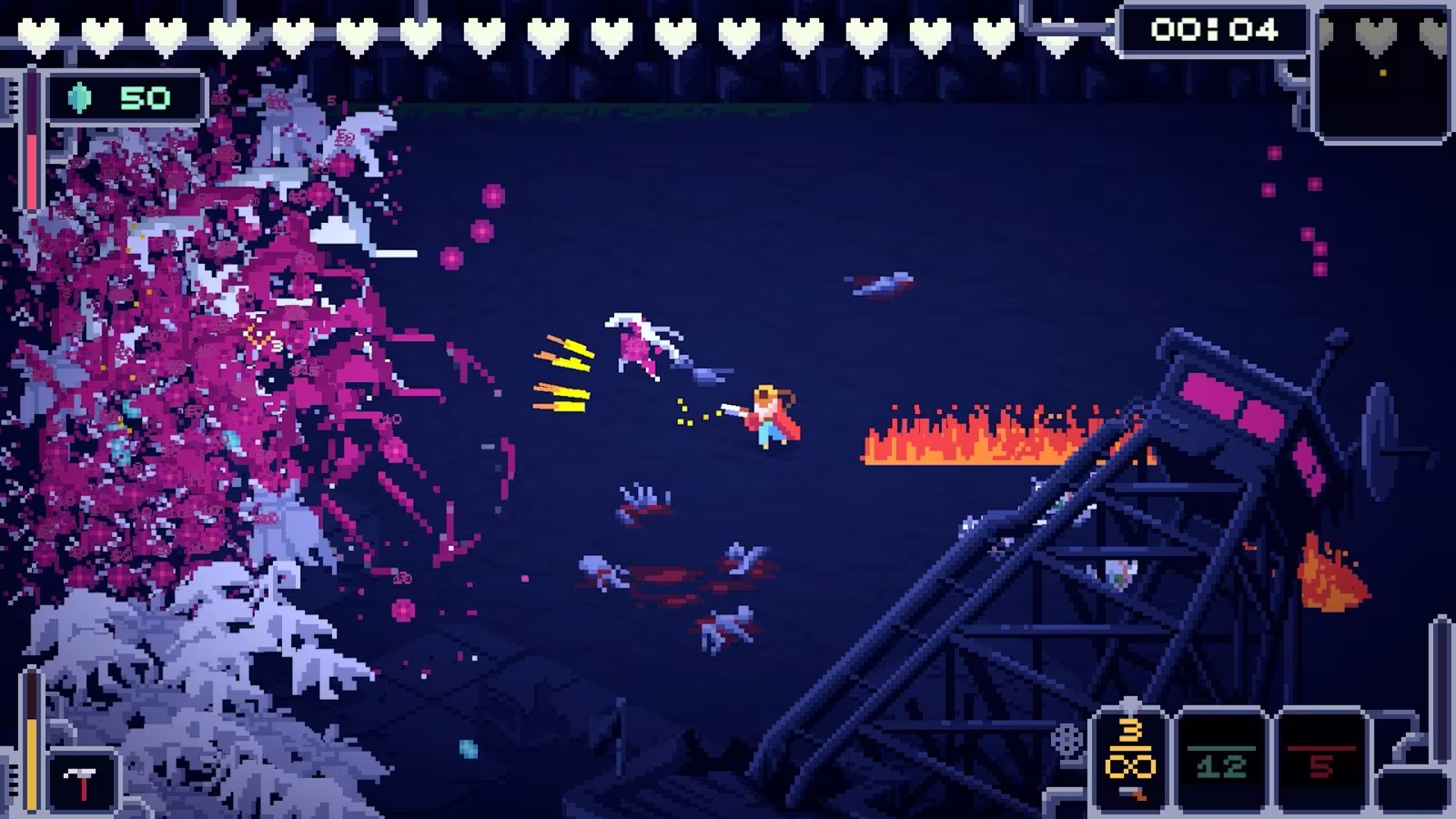遊戲以像素風呈現俯視視角戰鬥,可透過左鍵射擊、右鍵近戰攻擊、並以滑鼠準星瞄準敵人。隨著等級提升,可自由打造專屬 Build,組合出屬於自己的生存戰鬥風格。