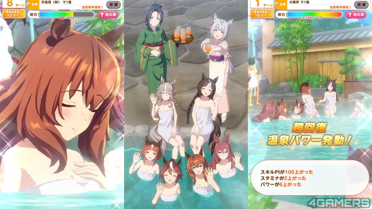 而如果訓練花費到一定的體力,還會隨機開啟「超回復」系統,不但會回復體力超過上限值,還會大放送各種技能提示以及各種強化的溫泉效果。