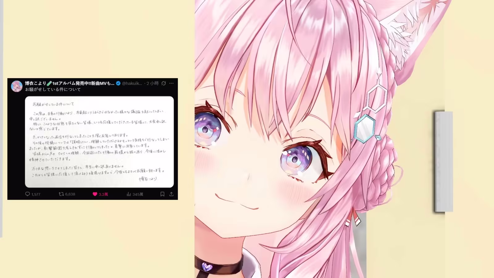VTuber經紀公司 hololive 所屬組合祕密結社 holoX 博衣小夜璃(可佑理,博衣こより)11月初回覆觀眾在社群平台 X 的批評貼文引爭議,事件迅速在網路發酵,演變成「誹謗中傷」與「言論自由界線」的論戰,面對風波本人今(7)日以手寫信道歉。