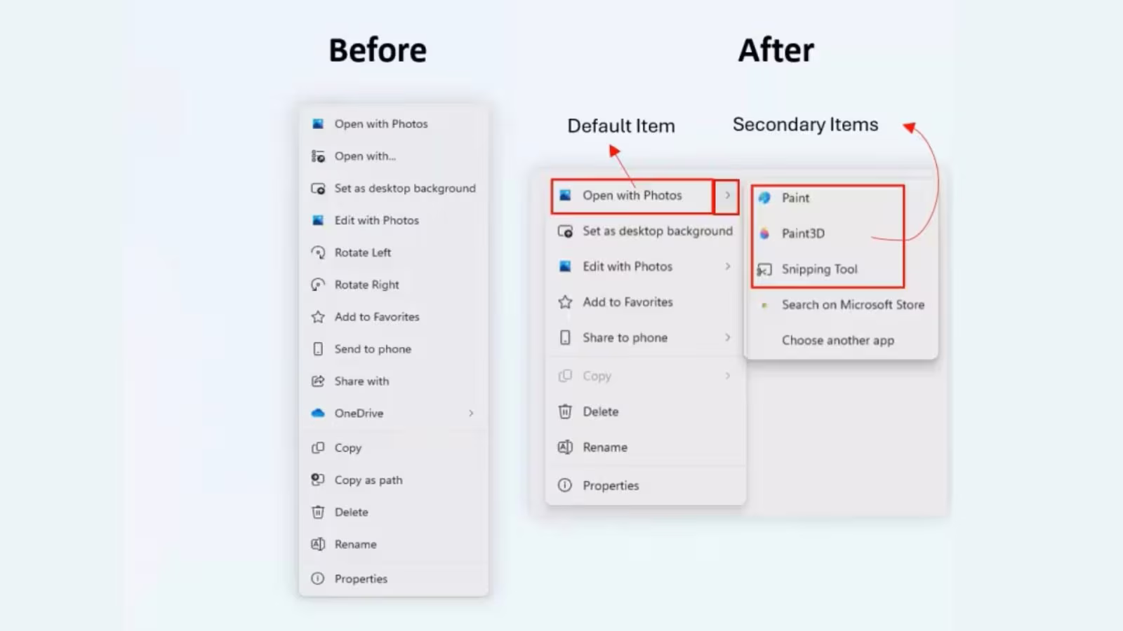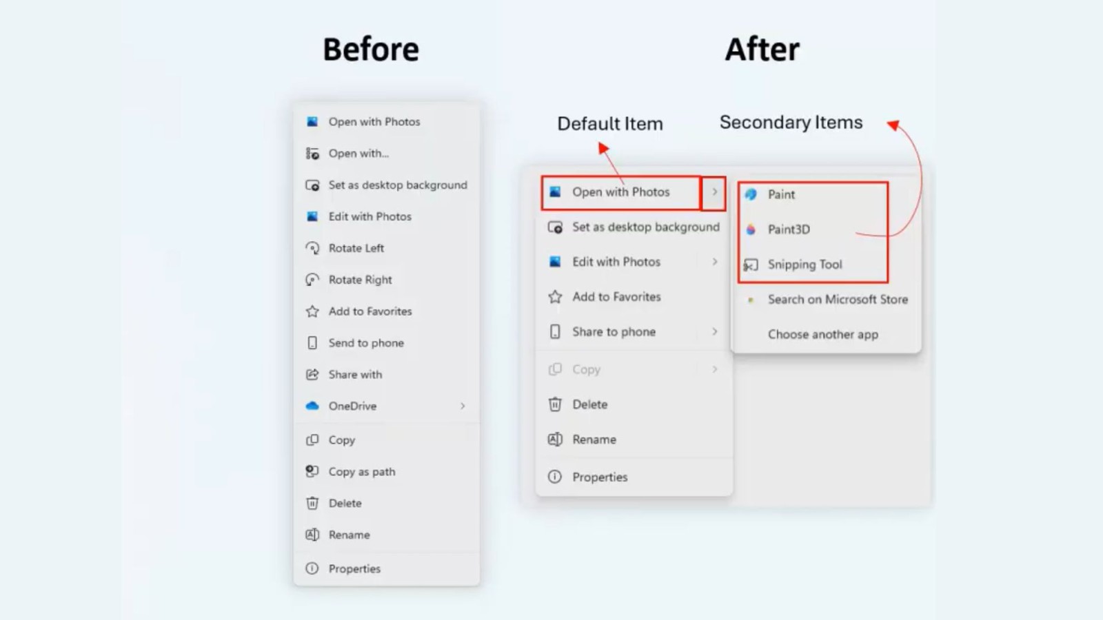 舉例來說,目前右鍵點擊圖片時可能會看到「開啟」、「以小畫家編輯」、「設成桌面背景」等多個項目;未來更新後,將僅顯示一個「以相片開啟」選項,滑鼠游標移上去後,次要操作如「以相片編輯」、「以畫圖開啟」、「使用擷取工具」等才會在側邊彈出。