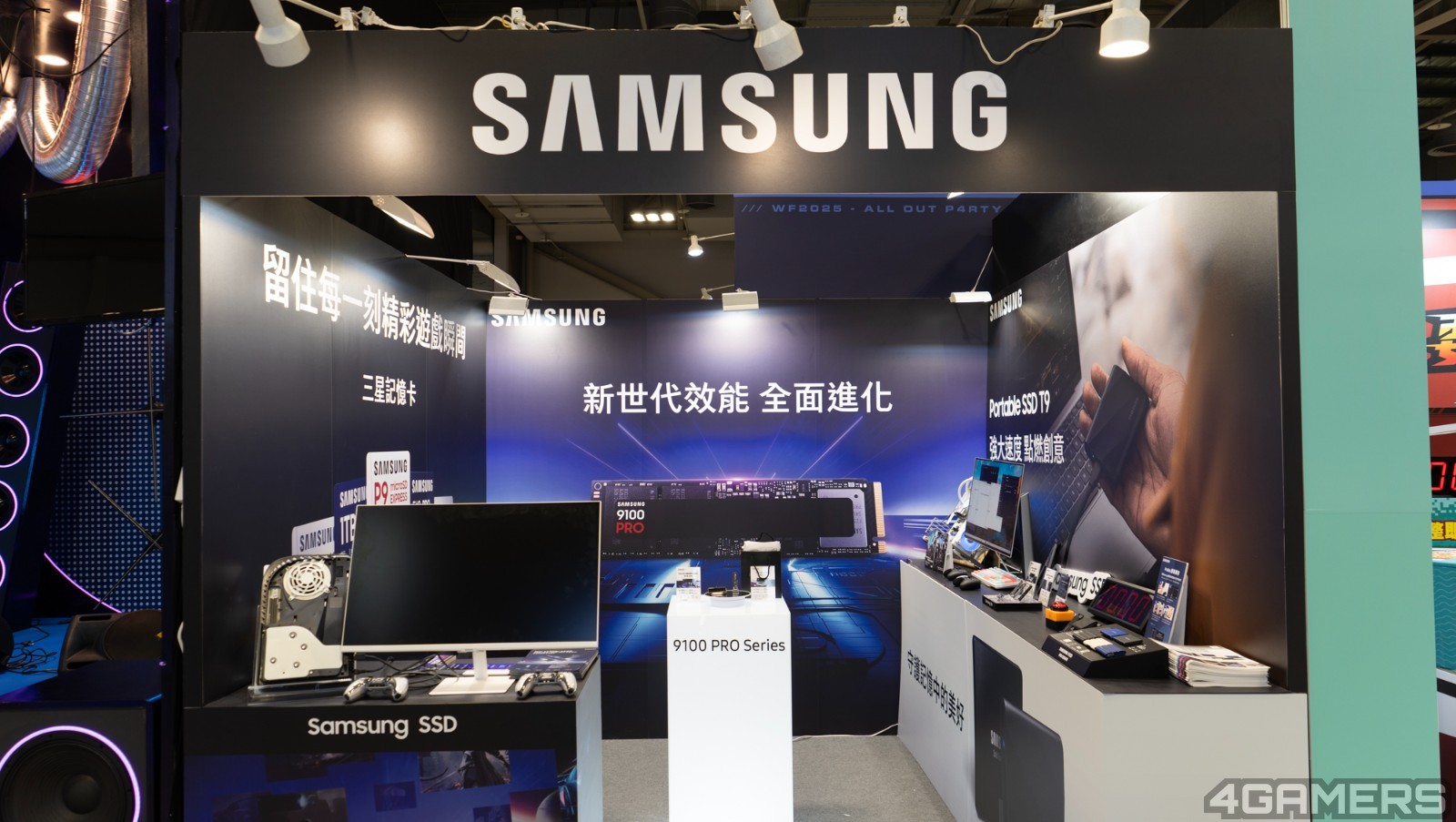 三星在 WirForce 2025 攤位展示了自家主打的 M.2 SSD 系列與外接式 SSD 系列,M.2 SSD 涵蓋 PCIe 5.0 的旗艦級 9100 PRO,最高讀取速度能達到 14,800 MB/s;針對主流電競採 PCIe 4.0 通道的 990 PRO,讀取來到 7,450 MB/s;以及入門無快取設計的 990 EVO Plus,速度能達到 7,250 MB/s。
