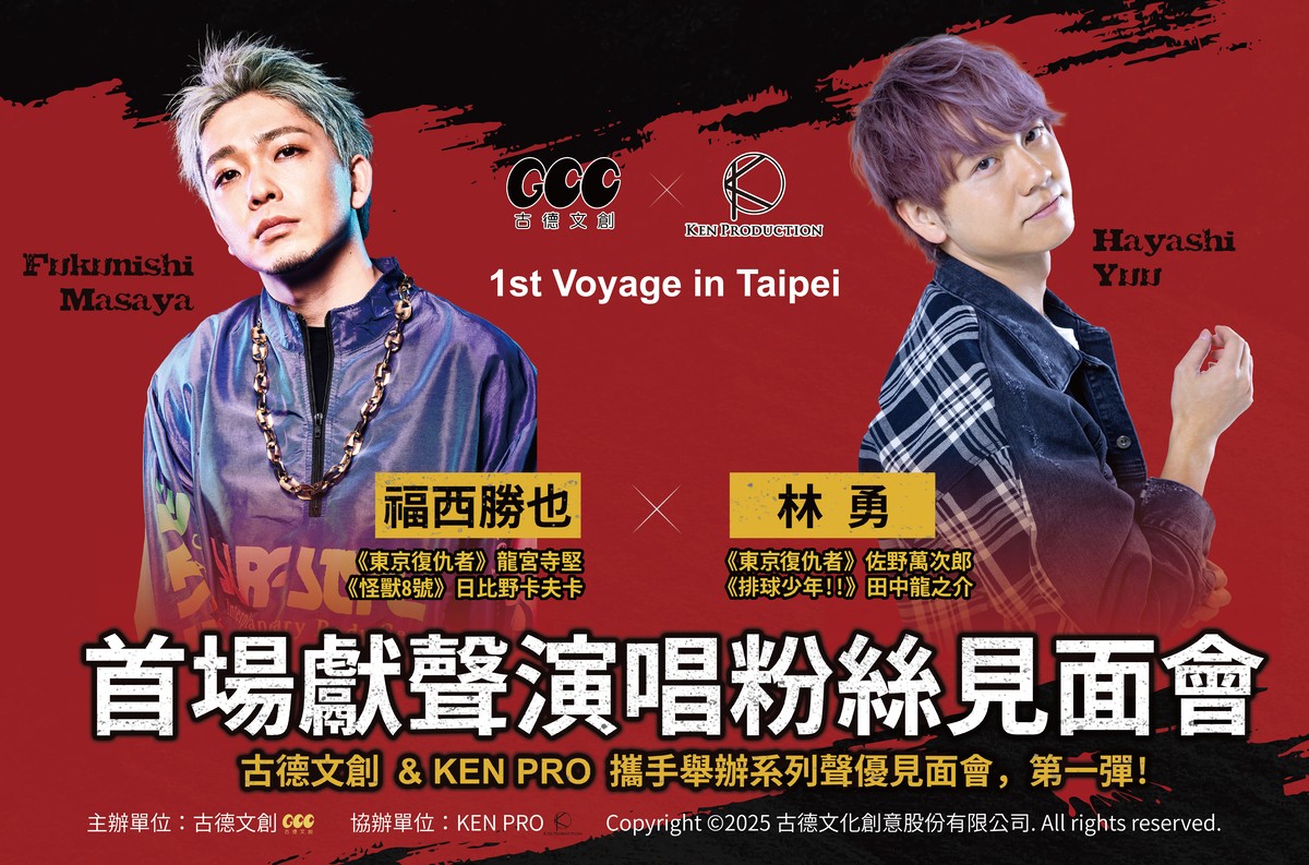 古德文創(GCC)與日本知名經紀公司 KEN PRODUCTION(賢プロダクション)宣布,將於 2025 年 12 月 13 日在台北花漾展演空間 HANASPACE 舉辦「GCC X KP 1st Voyage in Taipei」聲優見面會,邀請動畫《東京復仇者》中深受粉絲喜愛的兩位人氣聲優──林勇、福西勝也首次合體來台。