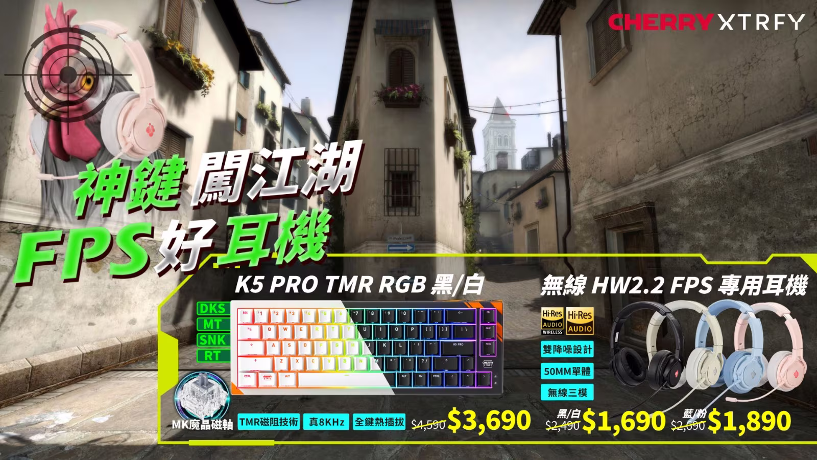 在今年最受玩家注目的 WirForce 中,CHERRY 帶來兩款專為「想先聽到、先反應、先擊殺」的 FPS 玩家打造的終極裝備:Cherry XTREY K5 PRO TMR 電競鍵盤與 HW 2.2 無線 FPS 專用電競耳機。兩款核心武器共同組成 Cherry FPS 專用神武,讓玩家在反應速度、音源定位與操作精度上全面升級,盡情把戰場節奏掌握在自己手中。