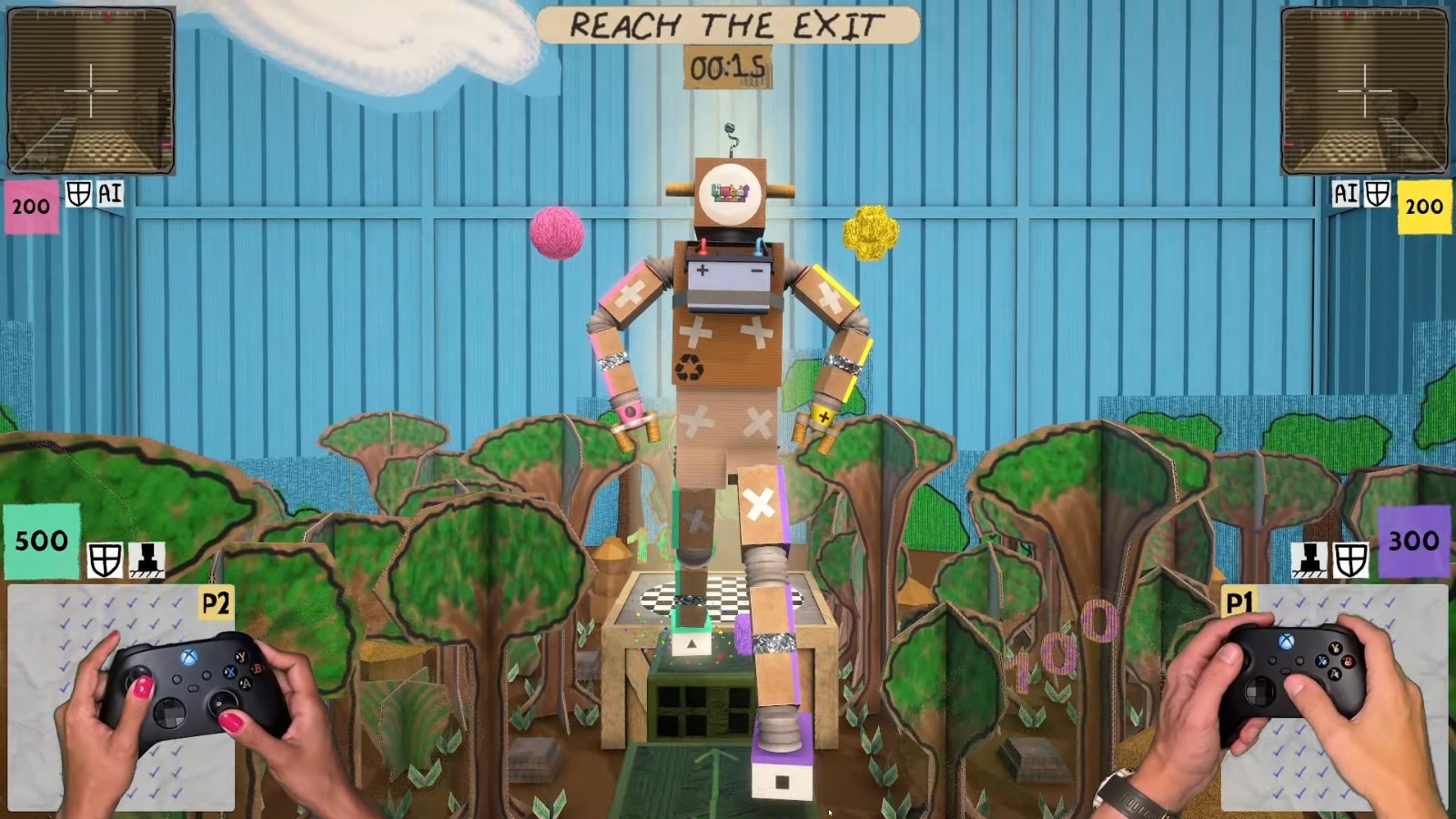 玩家必須控制紙箱巨人的四條肢體,可以一個人掌握所有動作,也能最多 4 人同視窗協力。每位玩家只負責其中一條手或腳,配合隊友讓紙箱巨人站得住、打得到、踢得準,是這款遊戲的核心樂趣。