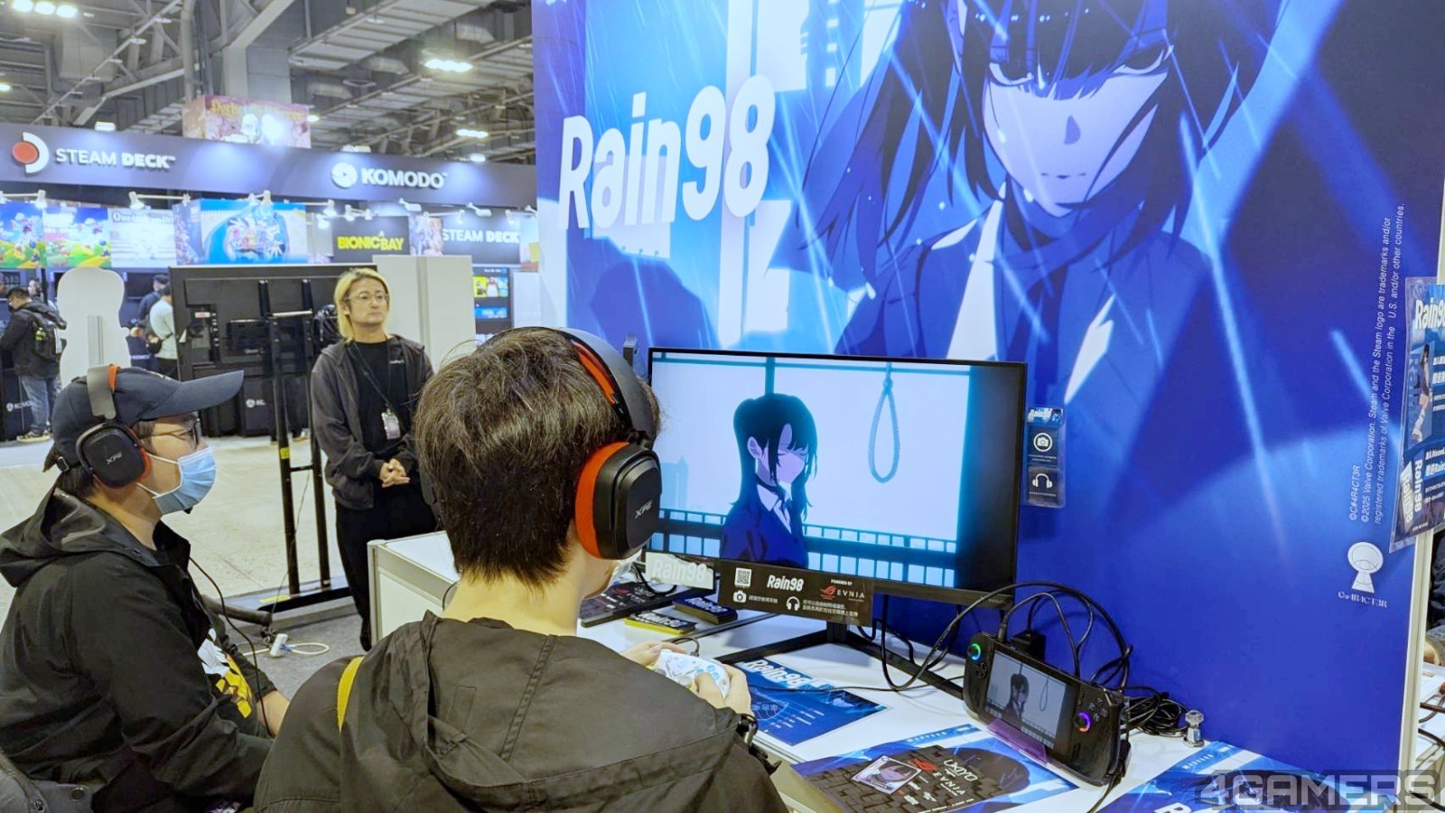 以《Rain98》遊戲中的女主角雨原玲奈設立斗大的人形立牌,位於 EE-02 攤位的 Ukiyo Studios工作室分別帶來許多各俱特色的恐怖遊戲,包含 3D 第一人稱視角探索的《HR: Human Remains》,還有洛式克蘇魯主題的恐怖釣魚新作《Mourning Tide》,黑暗風格地下城探索遊戲《Horripilant》,以及俄羅斯團隊開發的童話風恐怖遊戲《SOVIET SPOOKY TALES: Green Eyes》