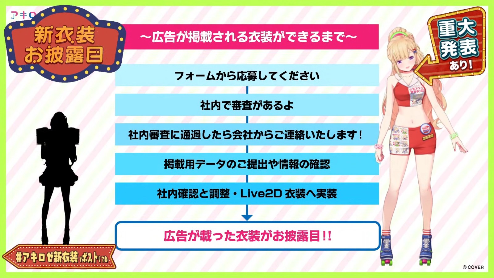 Aki 本次新衣裝靈感源自活動宣傳,就像許多實體賽事團隊的選手或啦啦隊員,身上會穿著贊助商標籤的衣服一樣,提供 VTuber 與品牌或企業整合行銷的效果。