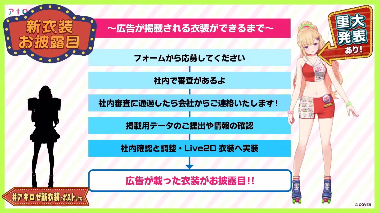 申請流程從填寫專用表單 → 提交品牌資料 → 審查 → 確認刊登內容 → 實裝至 Live2D 衣裝 → 衣裝公開展示,審核結果僅會通知通過的申請者,廣告刊登將依預算、企劃及刊登期間等條件調整,若申請過多也可能採取抽選方式。