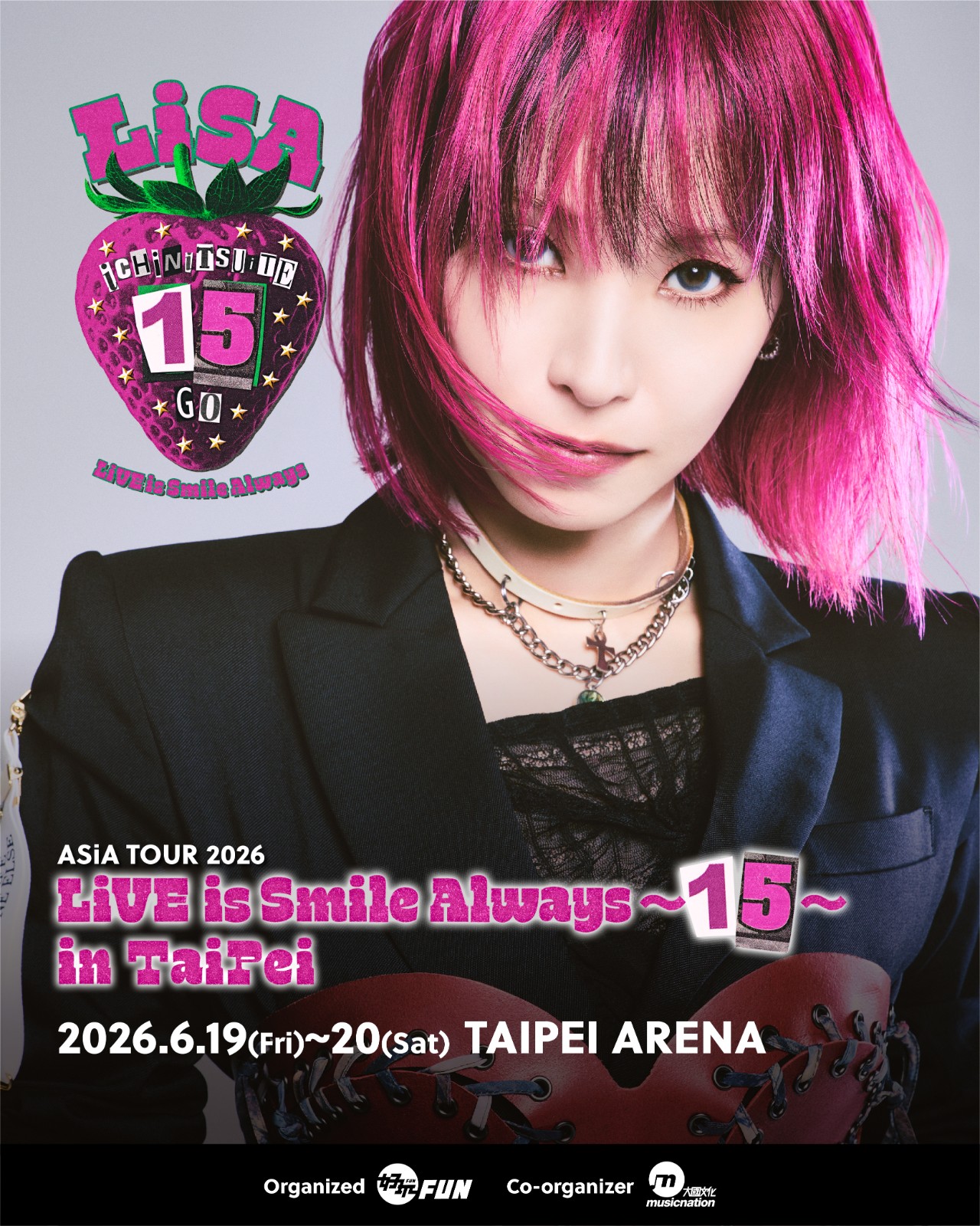 日本搖滾歌姬 LiSA 今(5)日宣布將於 2026 年展開睽違兩年的個人亞洲巡迴演唱會「LiVE is Smile Always~15~(iCHiNiTSUiTE GO)」,不僅是紀念她出道滿 15 週年的重要里程碑,也終於實現多年來與台灣歌迷之間的約定:站上台北小巨蛋的舞台開唱。