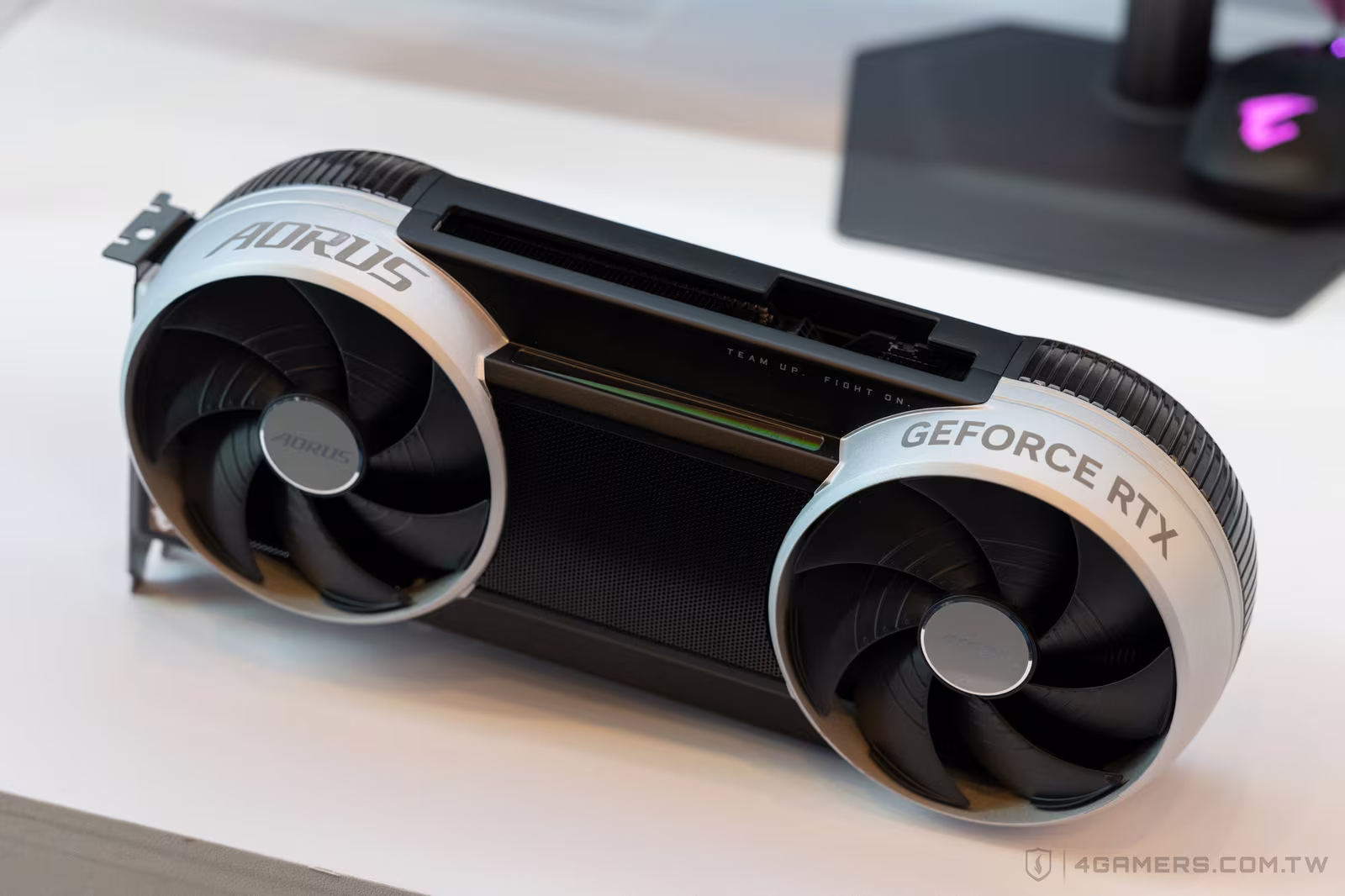 技嘉於 CES 2026 推出 40 週年紀念顯卡 AORUS GeForce RTX 5090 INFINITY,兩端圓潤筒狀的造型就如同噴射引擎般,相當吸睛。