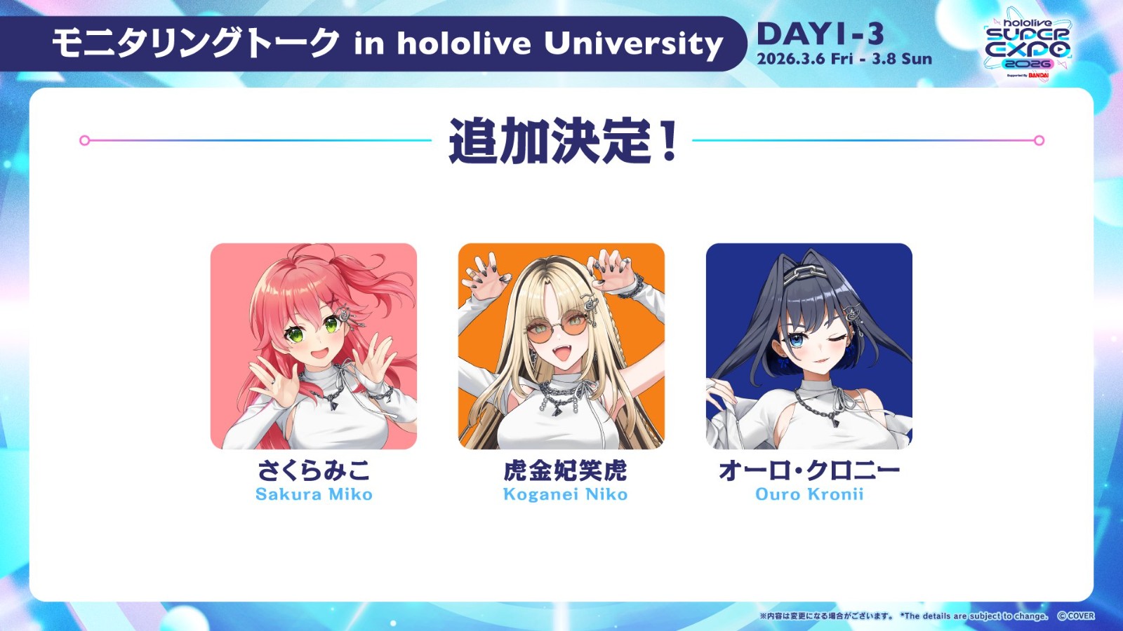 SUPER EXPO 內的攤位 hololive 大學舞台見面活動追加櫻巫女、笑虎跟 Kronii 三人。