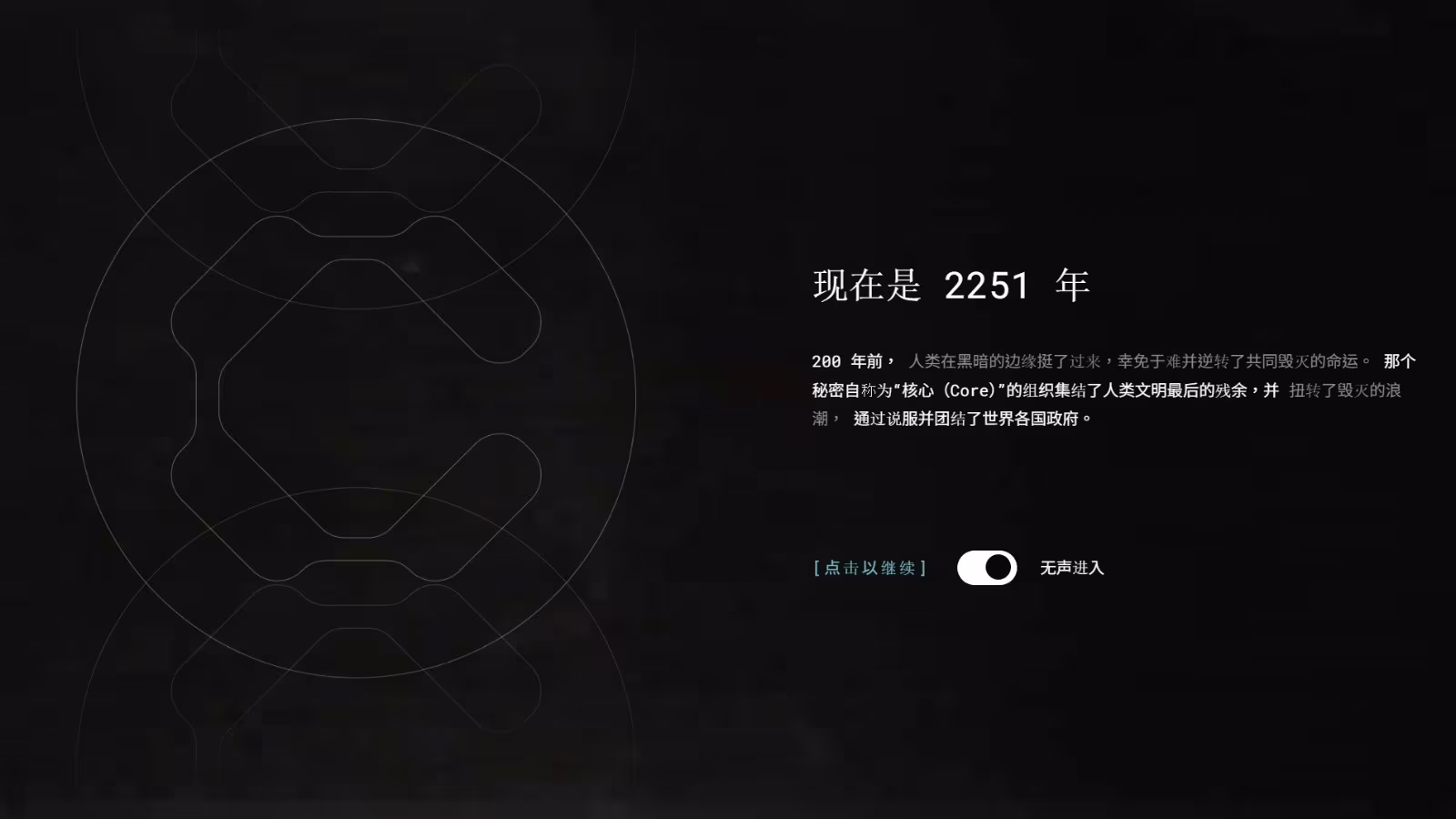 故事來到在西元 2251 年,人類站在絕種邊緣。根據官方世界觀描述,約在 200 年前,人類一度瀕臨全面毀滅的深淵,直到自稱為「Core(核心)」的神祕組織暗地行動,集結文明殘存的一切力量,說服並團結各國政府,才勉強扭轉了毀滅的命運。