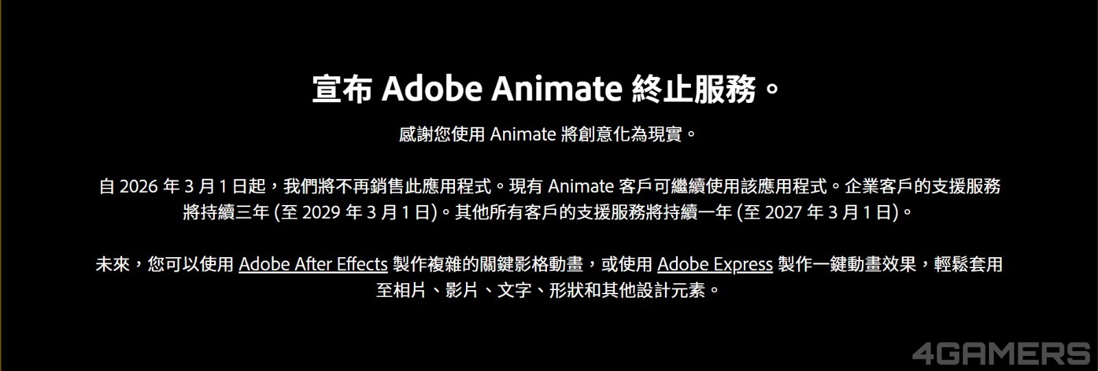 根據 Adobe 說明,目前 Adobe Animate 的用戶當中,企業版(Enterprise)客戶的支援服務將持續至 2029 年 3 月 1 日,為期三年;其他一般用戶則可使用至 2027 年 3 月 1 日,支援期為一年。