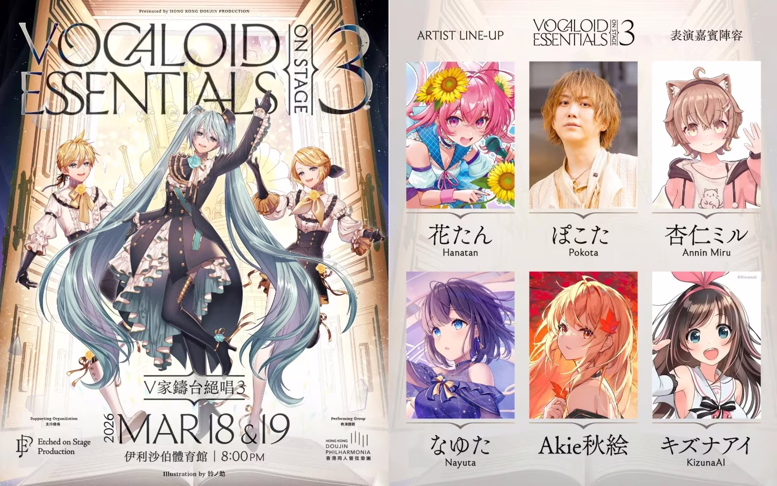 Vocaloid 音樂盛會再度回歸香港,深受樂迷好評的《Vocaloid Essentials on Stage》系列正式宣布第三彈演出「V家鑄台絕唱 III」將於 2026 年 3 月 18 日至 19 日 一連兩場,於伊利沙伯體育館表演場 盛大舉行,官方今日公開演出完整陣容。