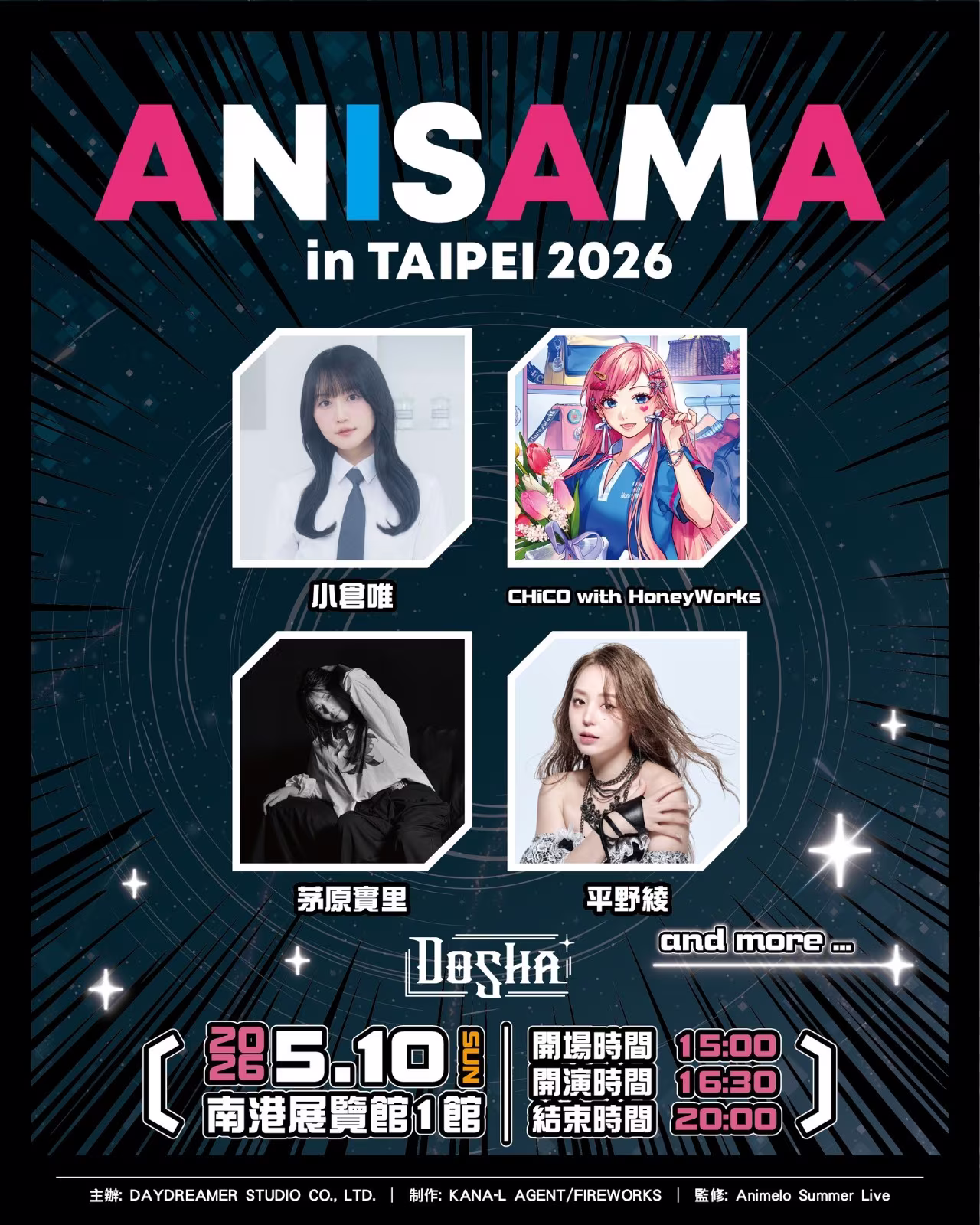 日本最大規模的動漫音樂祭典 Animelo Summer Live(簡稱 ANISAMA)迎來 20 週年再登台灣!「ANISAMA in TAIPEI 2026 -DOSHA!-」將於 2026 年 5 月 10 日在台北南港展覽館一館四樓舉辦,第一波卡司同步公開:小倉唯、CHiCO with HoneyWorks、茅原實里、平野綾確定登台。