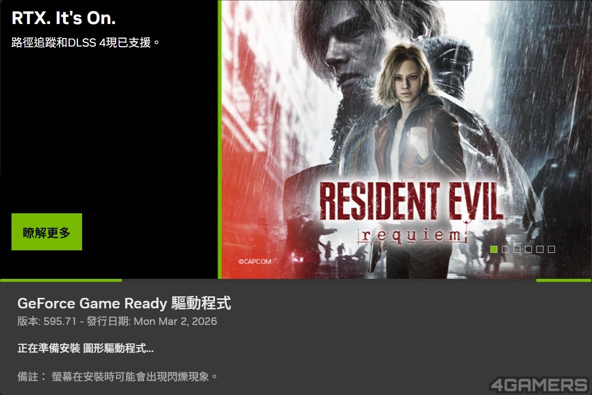 NVIDIA 今(3)日釋出 GeForce 顯示卡全新 Game Ready 驅動程式 595.71 WHQL,緊急修正先前 595.59 版本引發的嚴重 GPU 風扇監控錯誤,同時補上對卡普空新作《惡靈古堡9:安魂曲》(Resident Evil Requiem)的首日最佳化支援。