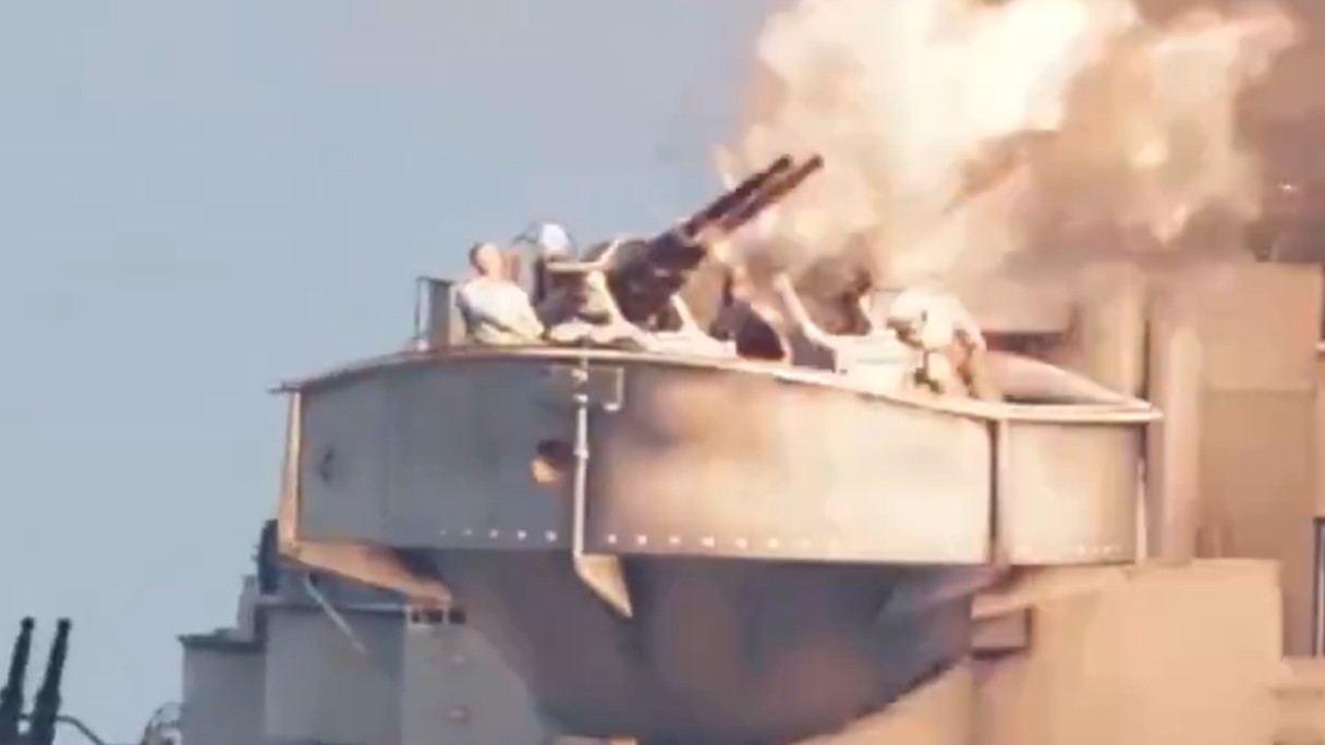 畫面顯示一艘疑似受損的美國軍艦火力全開,朝一架伊朗戰鬥機猛烈射擊,最終擊中對方並引發爆炸,戰機墜毀在軍艦附近海域。