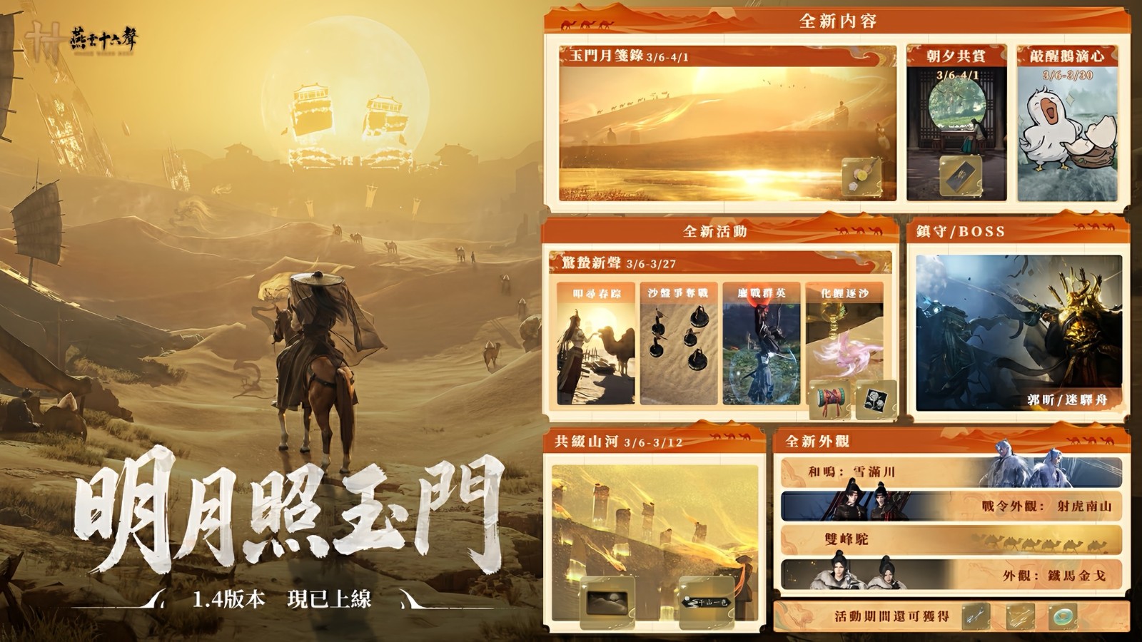 武俠開放世界動作冒險 RPG《燕雲十六聲》在 3 月 6 日已正式更新 1.4 版本「明月照玉門」,首先開放「玉門關」區域,後續還有「涼州」、「秦川」等地區將自四月份起逐步開放。