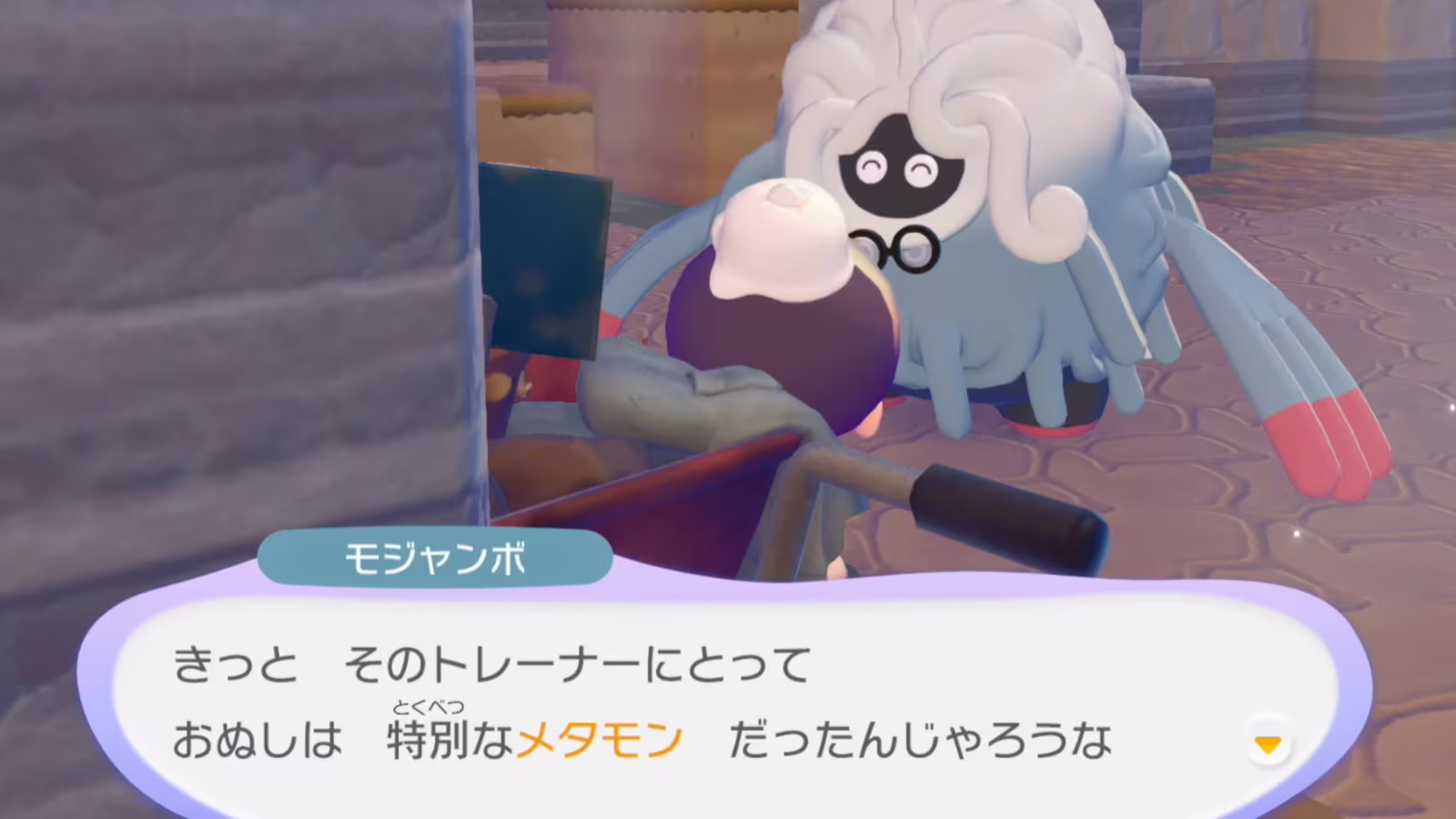在《Pokémon Pokopia》一開始,玩家所扮演的百變怪醒來後,由於思念自己原本的訓練家,才變身成人類的樣子(也就是搭配捏角色的環節),接著很快就會看到巨蔓藤博士,而他會問你的名字,在劇情中,問的是當時訓練家為百變怪取的名字。