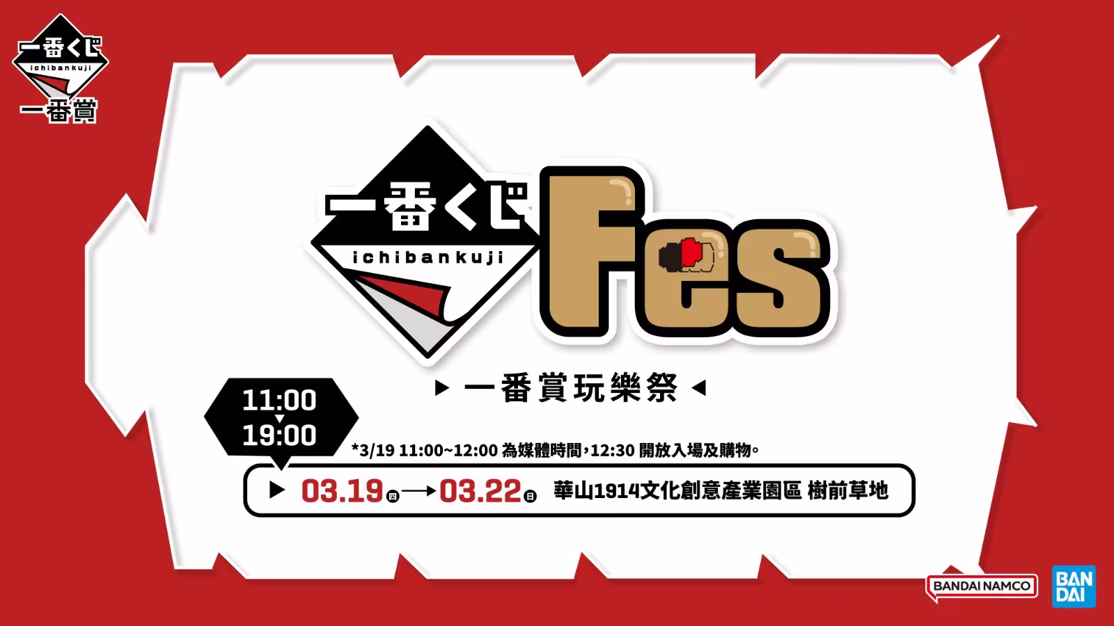 台灣萬代南夢宮玩具事業部宣布,將於 3 月 19 日至 3 月 22 日在華山 1914 文創園區舉辦「一番賞 Festival 玩樂祭」。本次為一番賞在台首次舉辦的單獨品牌活動,現場將展示多款首次於台灣亮相的一番賞商品,並規劃互動裝置與限量贈品活動。
