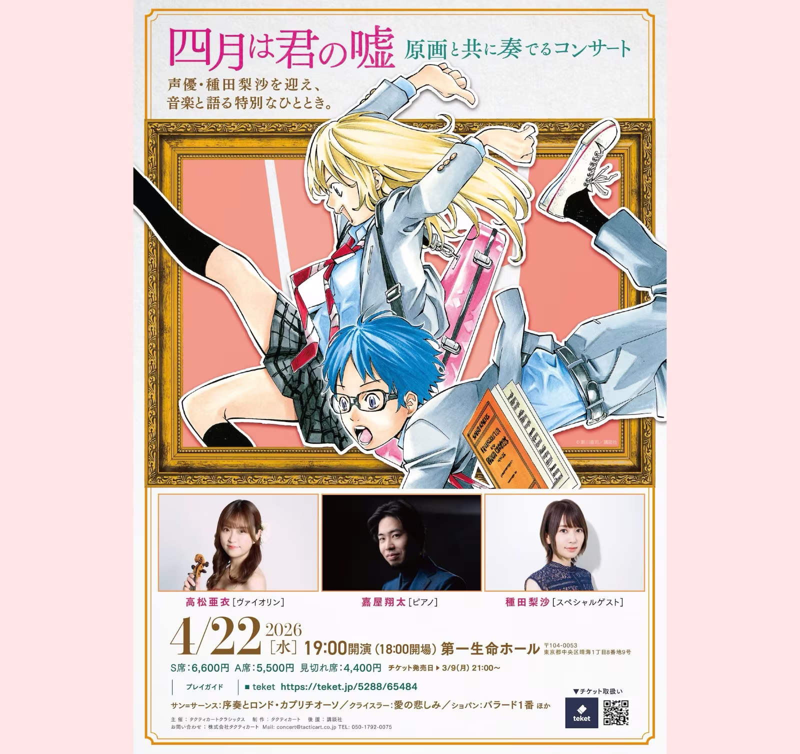新川直司漫畫作品《四月是你的謊言》(四月は君の嘘)音樂會「四月は君の嘘 原画と共に奏でるコンサート」確定於 4 月 22 日日本東京第一生命音樂廳開演。