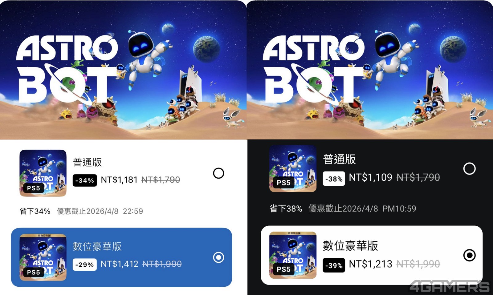 4Gamers 編輯部內部實測,以《宇宙機器人》(ASTRO BOT)為例,一位今年尚未開過 PS5,且沒有任何會籍的玩家,看到的折扣為 38%,折扣高於另一位近期有遊玩 PS,且擁有高級會員的玩家(34%)。