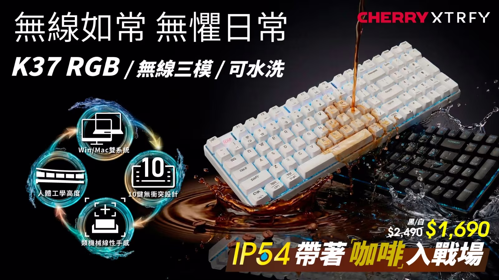現在,終結這一切的救星來了,Cherry Xtrfy 隆重推出 K37 無線三模電競鍵盤 —— 它不僅無懼飛濺,更要讓你專注於勝利,無後顧之憂。