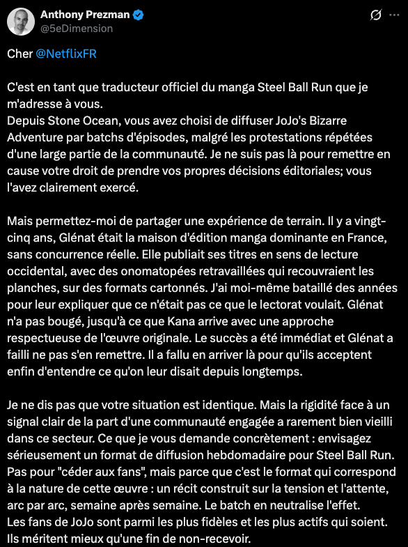 法國《飆馬野郎》漫畫官方譯者 Anthony Prezman 更引用了 Netflix 官方貼文,對《JOJO》粉絲抗議風波表示自己的看法。