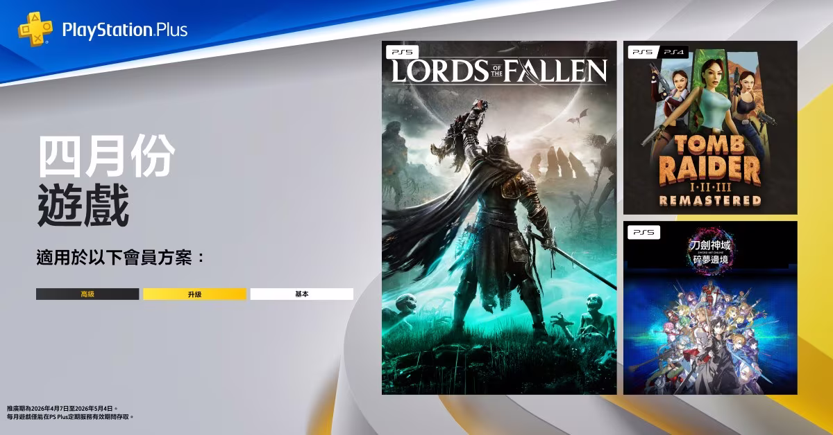 PlayStation 於今(2)日公開了 4 月的會員免費遊戲陣容,入列的包括《墮落之王》(Lords of the Fallen)、《刀劍神域 碎夢邊境》、《Tomb Raider I-III Remastered》。