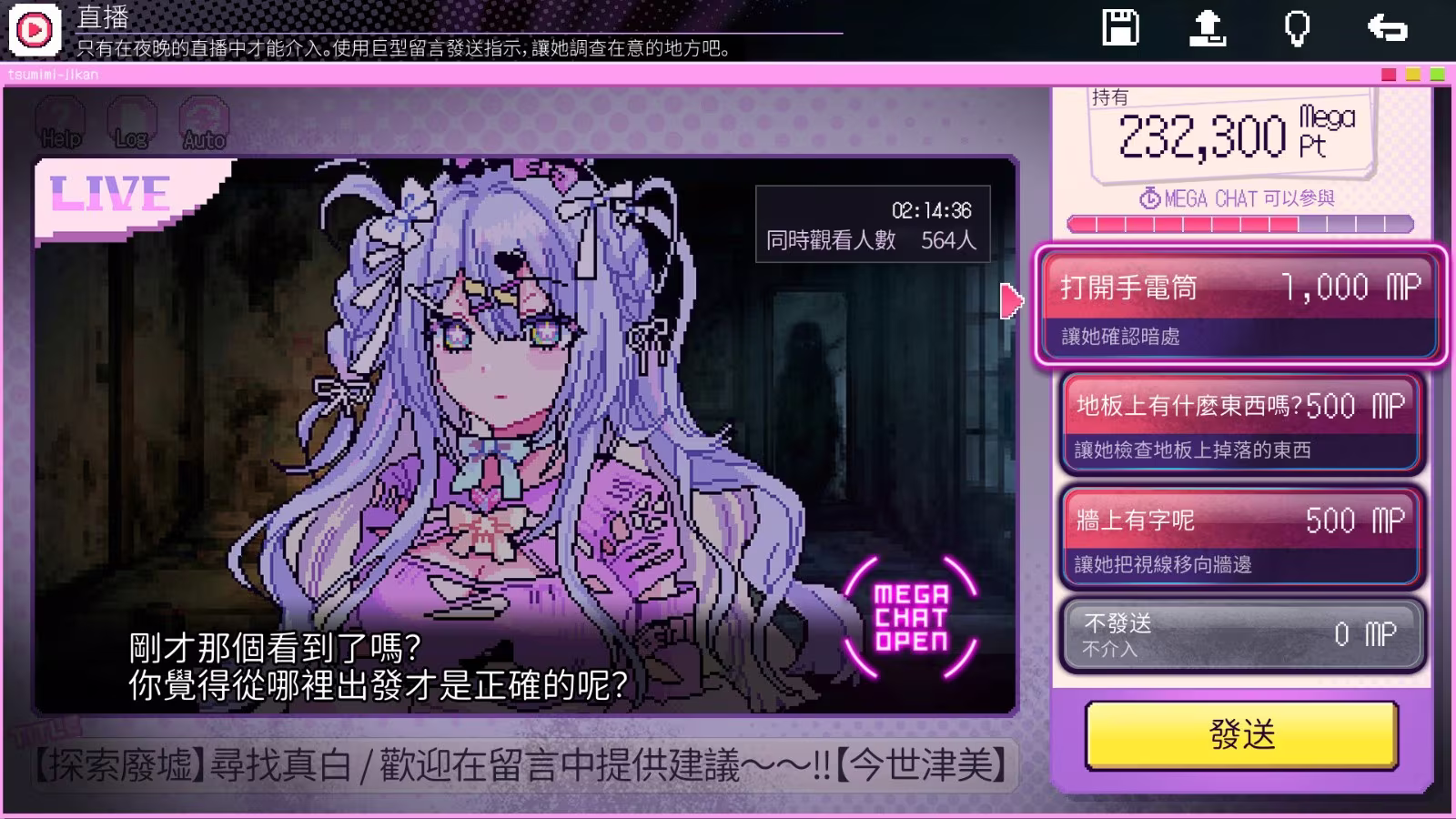 遊戲流程分為晝夜兩個階段。在白天,玩家需要透過社群平台(SNS)及粉絲網站收集各類蛛絲馬跡;到了晚上,則必須一邊觀看直播,一邊透過 SC、留言與贈送禮物等互動方式干涉直播走向,從中挖掘出潛藏在影像背後的異樣感與真相。深夜送出的禮物,可能在次日的直播中引發意外。