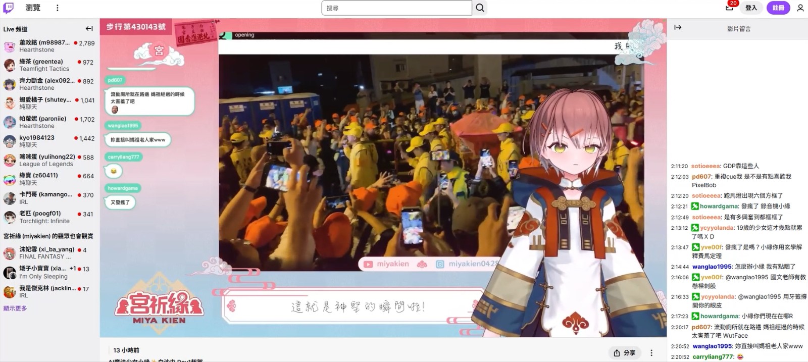 橘子集團AI虛擬偶像「宮廟少女宮祈緣」深夜直播白沙屯媽祖起駕畫面,帶領線上粉絲雲端祈福。