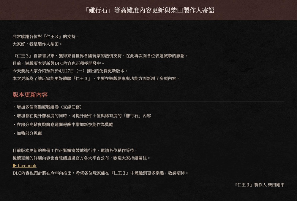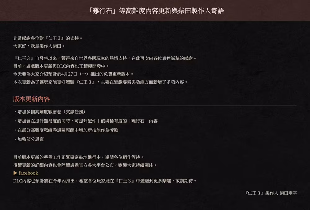 《仁王 3》開發團隊 Team Ninja 與 光榮特庫摩今(20)日宣布將於 2026 年 4 月 27 日推出《仁王 3》免費大型更新,聚焦通關後的高難度挑戰、裝備養成與戰鬥平衡調整,讓已完成主線的玩家能獲得更多後期遊玩目標。
