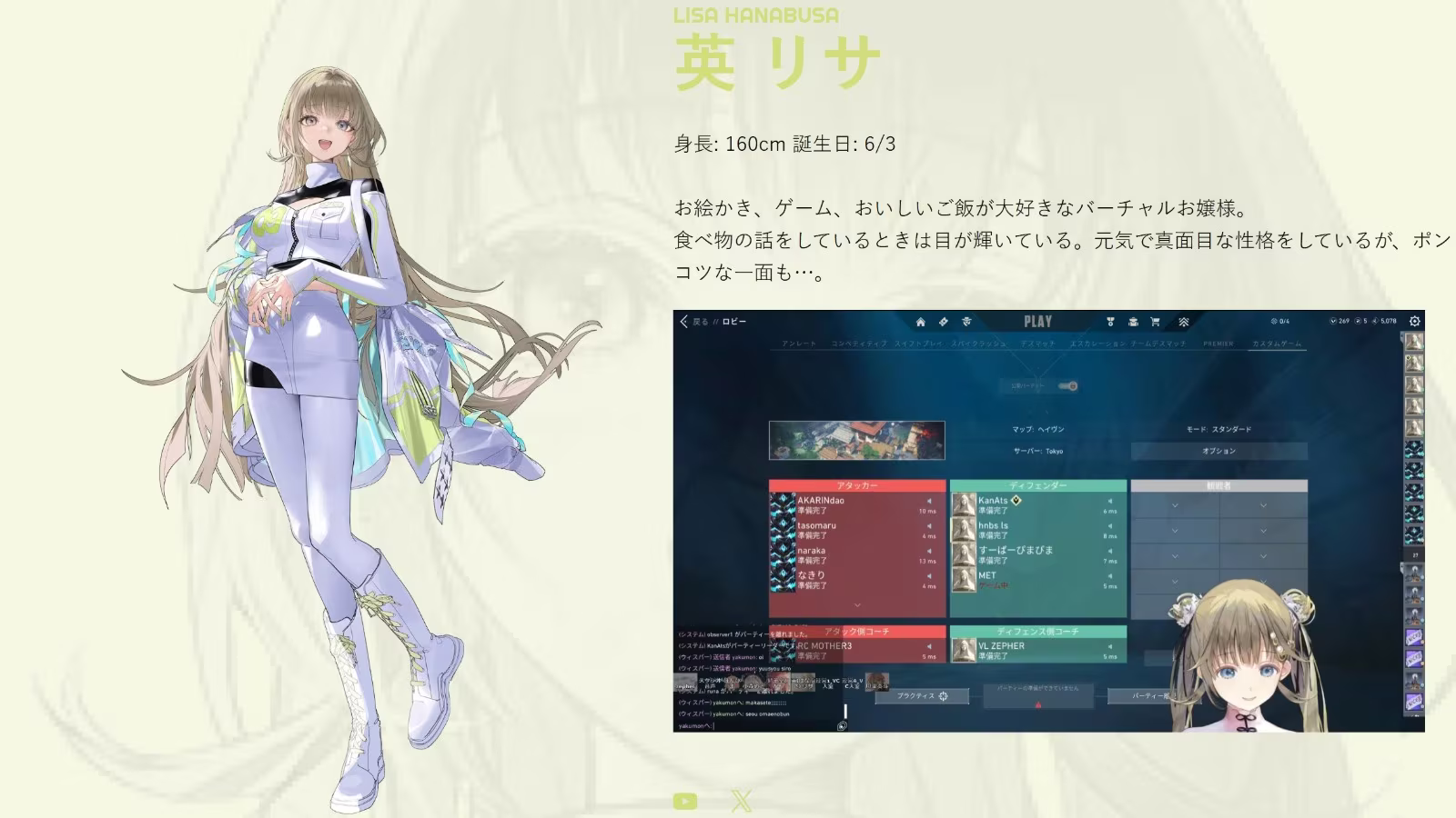 英リサ自 2020 年加入 VSPO! 憑藉成熟優雅的大小姐氣質、沉穩談吐與爽朗笑聲累積高人氣,也因擅長《Apex 英雄》與《特戰英豪》等 FPS 遊戲受矚目,除了直播活動,她近年也拓展演藝領域,曾參與《閃電十一人 英雄們的勝利之路》配音演出,實現身為系列粉絲的願望。