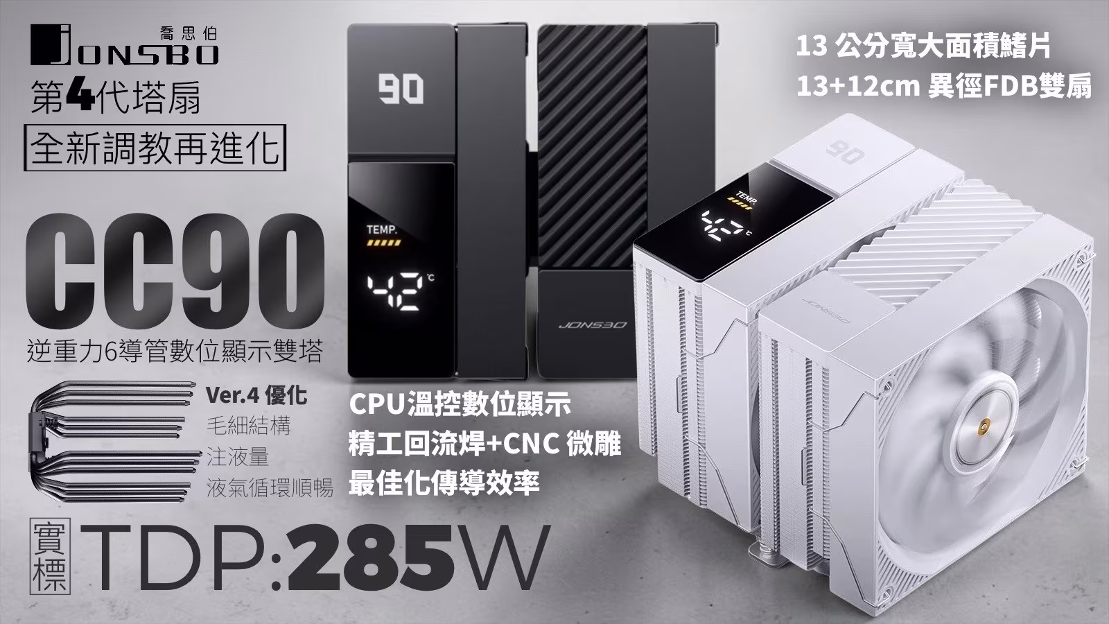 JONSBO CC90 數位顯示雙塔散熱器 —— 提供全黑化與全白化兩種機甲質感塗裝,並具備原廠直營 3 年安心保固,以數據定義溫度,以硬核實力鎮壓廢熱。目前已經上市,有全黑/全白可選,售價為:2290。