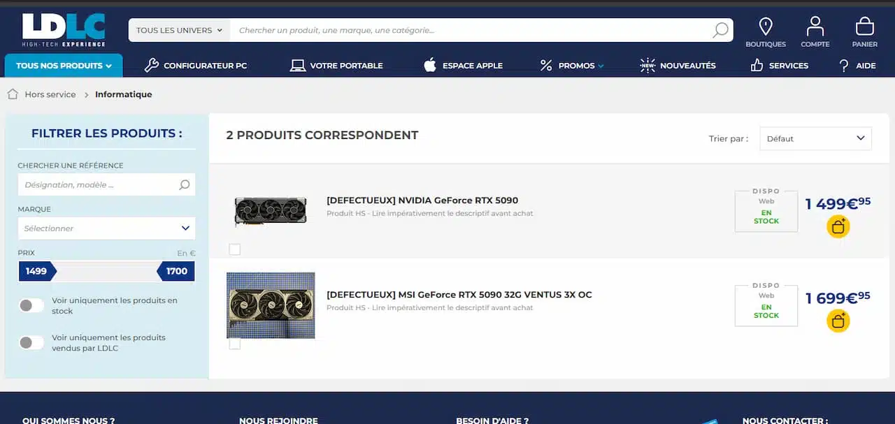 法國 3C 網路賣場 LDLC 在近期販售多個品牌的 RTX 5090 顯示卡「福利品」,話雖如此,但每個商品的標題上都標註為「Defective」,及這些卡片都是故障無法使用的,並在商品介紹頁面中,也明確告知這些 RTX 5090 受到了物理性的損傷而損壞。