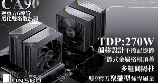 JONSBO喬思伯CA90第3代純黑化異扇雙塔:TDP 270W逆重力6導管絕對壓制