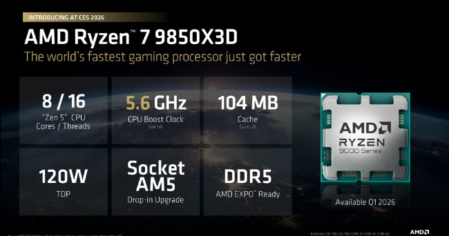 AMD Ryzen 7 9850X3D處理器2026第一季上市,遊戲表現領先對手27%