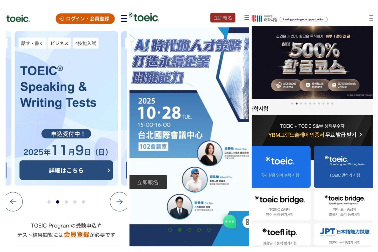 以下是日本多益,台灣多益,韓國多益的手機網站。