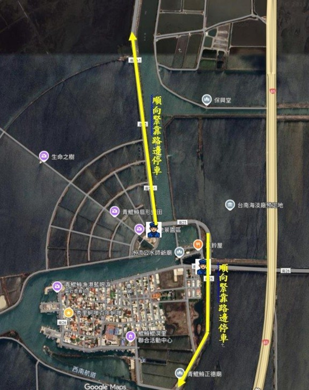 根據警方呼籲,遊客應在青鯤鯓扇形鹽田周邊沿南25線及南25-1線順向停車,並嚴禁併排停車、占用人行道停車、禁止紅線停車及其他占用道路等易生危害之違規。