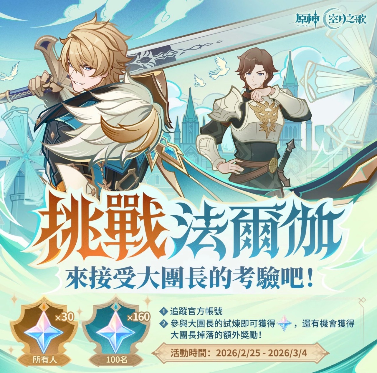 《原神》玩家注意⚔️——傳說中的西風騎士團大團長 法爾伽 終於現身!官方推出限時互動活動「挑戰法爾伽」,只要依指定方式留言參與,就能獲得原石與遊戲道具獎勵,還有機會再抽原石x160!