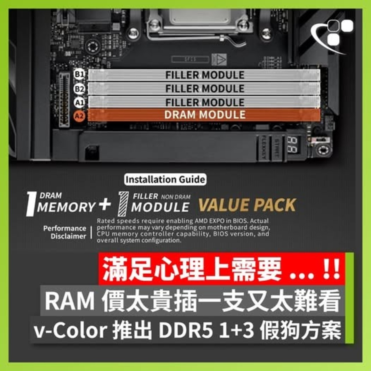 【轉發 😂】由於 RAM 價越來越貴,不少玩家組裝新機時只買得起 1 支 DDR5 記憶體,單插一支 RGB 燈效其實很難看。因此,v-Color 近日推出 1+1 DDR5 RGB 記憶體模組,以 1 支 DDR5 記憶體配搭 1 支 RGB「假狗」,為想玩 RGB 燈效的玩家提供更便宜的過渡方案。
