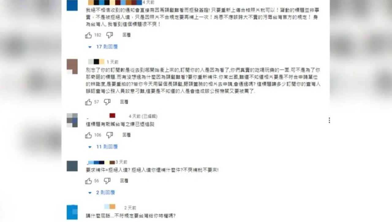 消息曝光後,大批台灣網友湧入留言區,「別忘了你的訂閱數是從去到哪開始衝上來的」、「這標題有栽贓台灣之嫌已退追蹤」、「只是補件而已,我還以為是外交部故意刁難......這標題讓人看了覺得不太舒服」、「要如何講話雖是個人自由,但不要失了分寸,台灣人喜歡你們,但並不代表話可以亂講,開玩笑開過頭了吧!」「這樣的言詞是誣蔑台灣」。