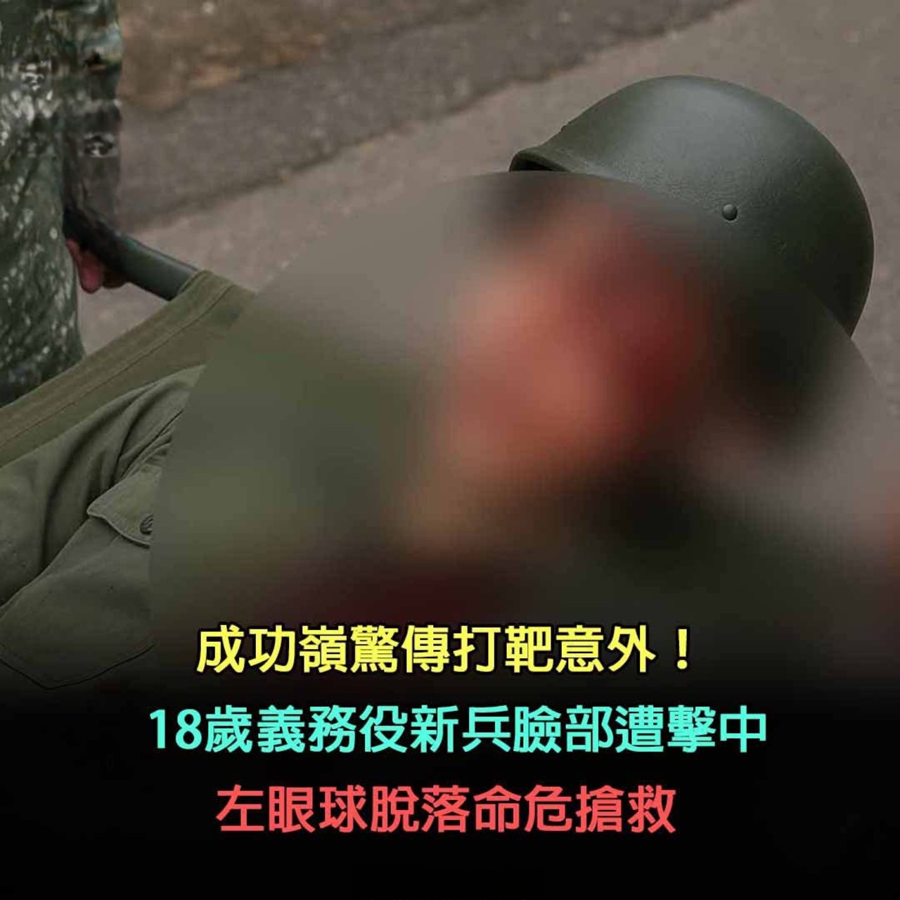 陸軍十軍團機步234旅邵姓義務役新兵,昨在台中成功嶺營區進行T91步槍射擊訓練時,子彈突然不明擊發,該新兵左臉被炸傷,子彈碎片卡在腦部,左眼珠掉落,有失明之虞,經被送往烏日林新醫院緊急開刀搶救,目前仍在加護病房觀察;軍方專案小組調查發現,該起意外並非槍枝膛炸,槍械和保險開關都正常,是否誤擊仍待調查。