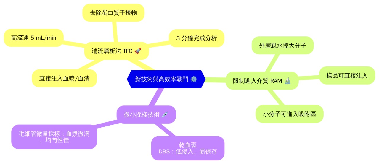 這是一種超快速的技術,可以直接注入血漿或血清樣品,幾乎不需要太多預處理。TFC 使用較大的顆粒和較高的流速(約 5 毫升/分鐘),在短時間內將蛋白質等親水性干擾物沖走,而目標分子則被保留在柱子上,整個過程可以在約 3 分鐘內完成。這讓分析速度大大加快。