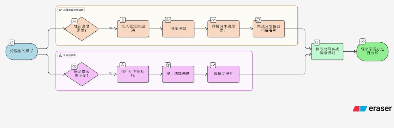 如果我們分離出來的液體太多,濃度太低,我們會用氮氣和熱量讓溶劑揮發掉。這樣剩下的體積就會變小,目標分子的濃度自然就提高了(濃縮)。接著,我們再加入與分析儀器相容的溶劑,讓寶藏準備好被檢測。
