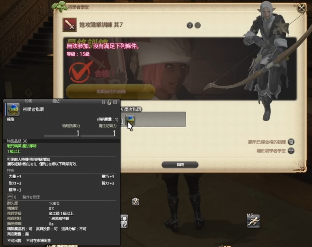 | 人物 15 等 | 30% 經驗加成戒指 | 初學者學堂 開放。完成後可獲得,適用於所有戰鬥職業 30 等以下時 30% 的經驗加成。 |