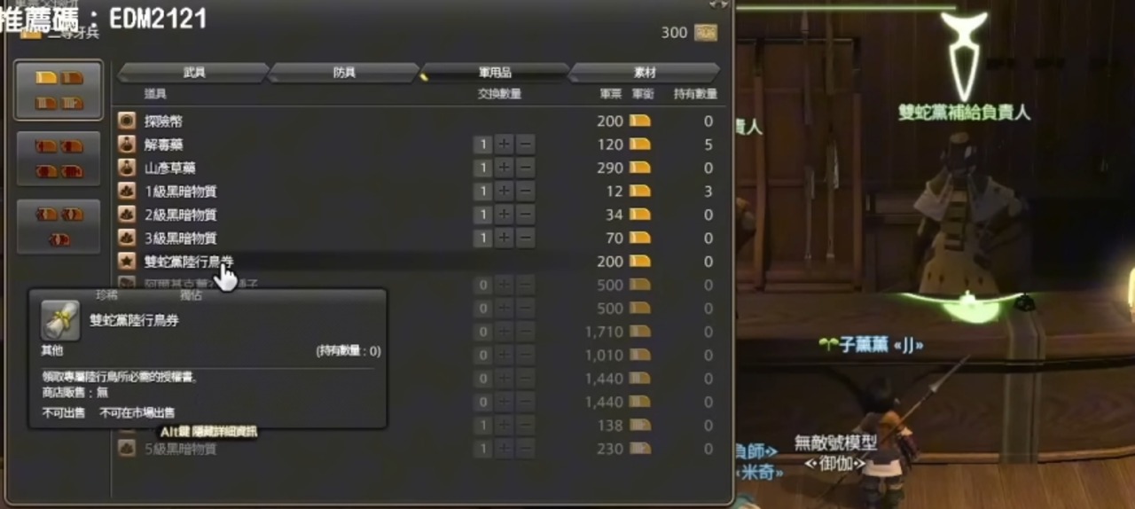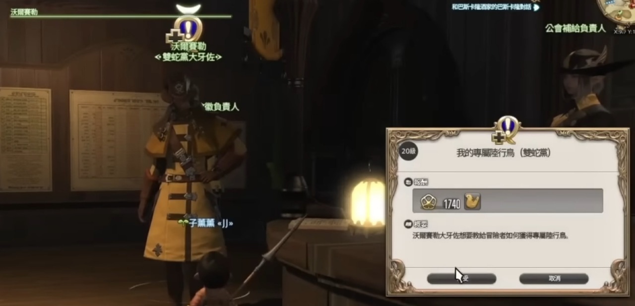 | 主線 20 等 | 解鎖坐騎(陸行鳥) | 1. 完成主線「前行之路」並加入任一軍團(選擇不影響)。 2. 到所屬的軍團櫃台旁接取任務「我的專屬陸行鳥」。 3. 繼續完成主線「直至大海吞噬一切」獲得軍票,到櫃台換取陸行鳥券即可獲得坐騎。 |