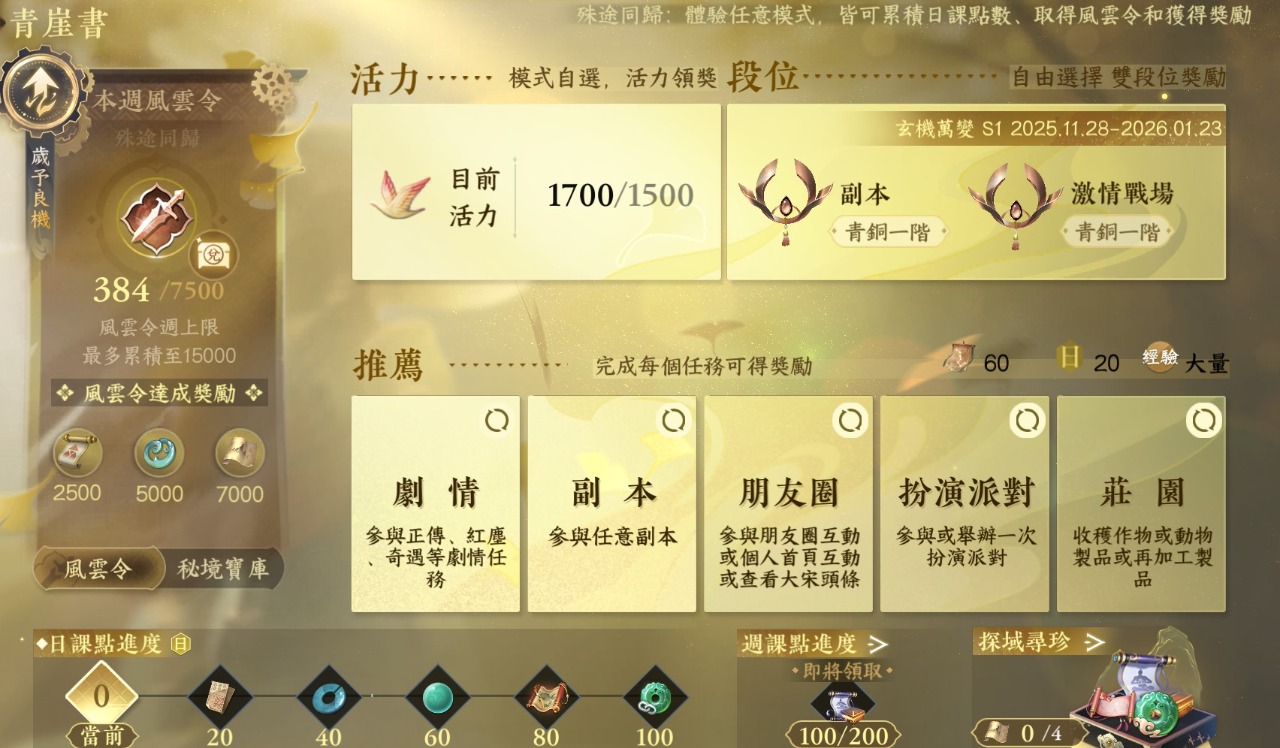 目前玩了幾天,發現遊戲內可以獲取**(綁定)紋玉**,可用於購買一些商城造型 而日課(每日任務)可以獲得大量紋玉,雖然目前玩起來造型不會加戰力,但在完成日課的過程中,可能解一些正傳(主線劇情)、或奇遇 就能使角色戰力一點一點提升,或是獲得一些裝備,玩起來沒什麼壓力,推薦喜歡看故事的朋友可以玩玩看,日課似乎可以累積三天,就算不天天上線也可以玩。