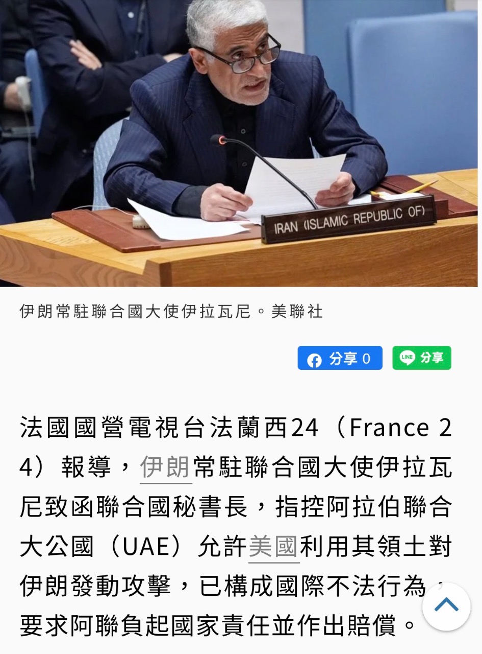 伊朗 德黑蘭並主張,阿聯應依國際法提供補償,包括所有物質損失與精神損害。 阿拉伯新聞(Arab News)報導,美以2月28日對伊朗展開軍事行動,德黑蘭隨即報復彈襲多個中東鄰國,阿聯成最大受災戶。截至3月17日,阿聯已遭伊朗1672架無人機和329枚飛彈攻擊。